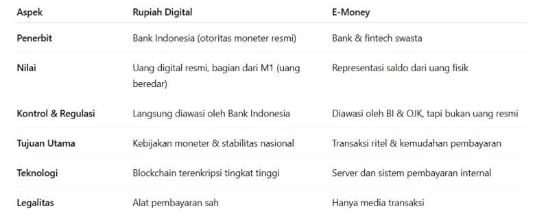 Banyak masyarakat mengira Rupiah Digital mirip dengan OVO, GoPay, atau LinkAja — padahal keduanya sangat berbeda. Rupiah Digital adalah “uang”, sedangkan e-money hanyalah “alat pembayaran”.